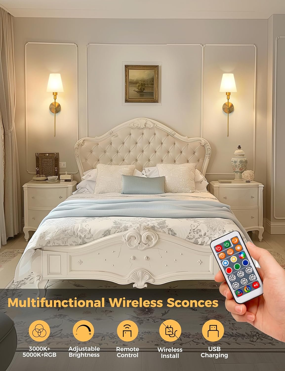 - ??Upgrade Wireless Remote Control- All Colors & Adjustable ??- The battery-operated wall sconce comes with a remote control, allowing for 10-level dimmable brightness (10%-100%) and adjustable color temperature (3000K/5000K/RGB). It also offers 6 timer options.