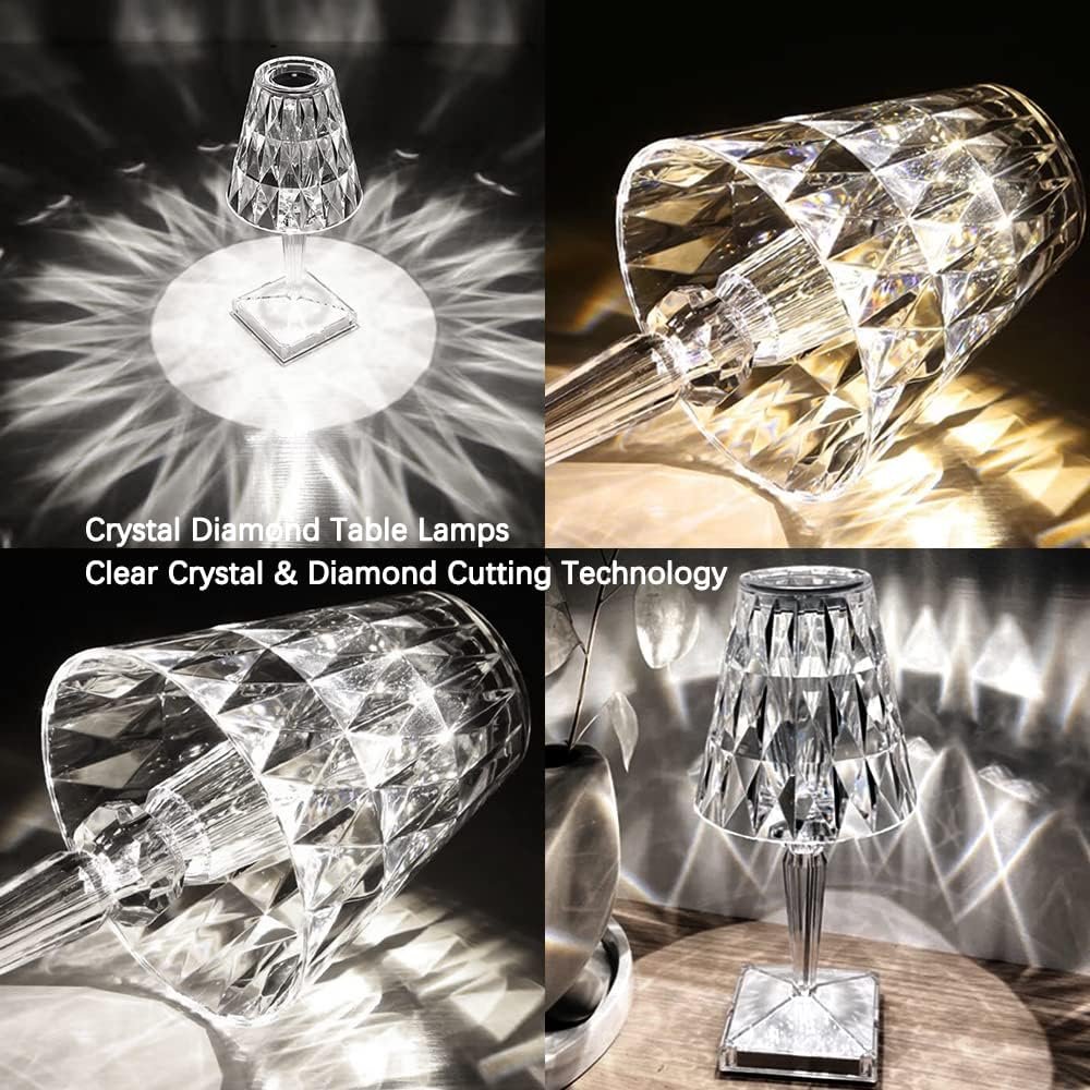 - ????USB Rechargeable Crystal Diamond Table Lamps??– Non-yellowing acrylic crystal table lamps come with a USB charging cable, built-in 2000mAh battery, no need to plug in when using. Crystal table lamp can be used for 10 -12 hours after being fully charged,the light used high quality LED chip, soft, warm light and no flicking.