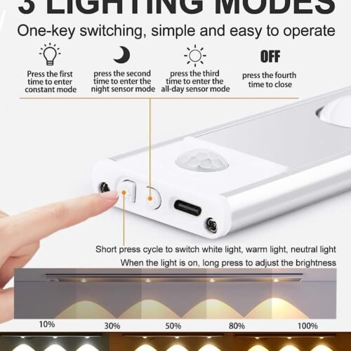 Motion Sensor Under Cabinet Light, 3 Hill Light Modes Stepless Dimming Under Closet Lights, Type-C USB Rechargeable Magnetic Counter Night Lights for Kitchen Wardrobe Cupboard