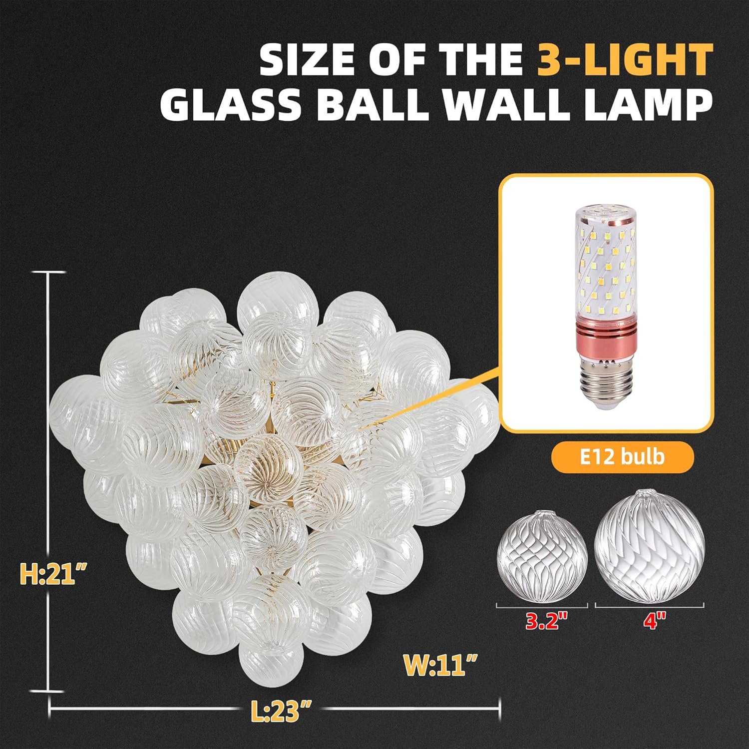Gold Bubble Wall Sconce Light, Swirled Glass Globes Wall Lamps, Sparkling Ribbed Glass Balls Wall Porch Lights, Wall Mounted Bathroom Vanity Light Fixture for Bedroom Bedside Stairway 23″ W