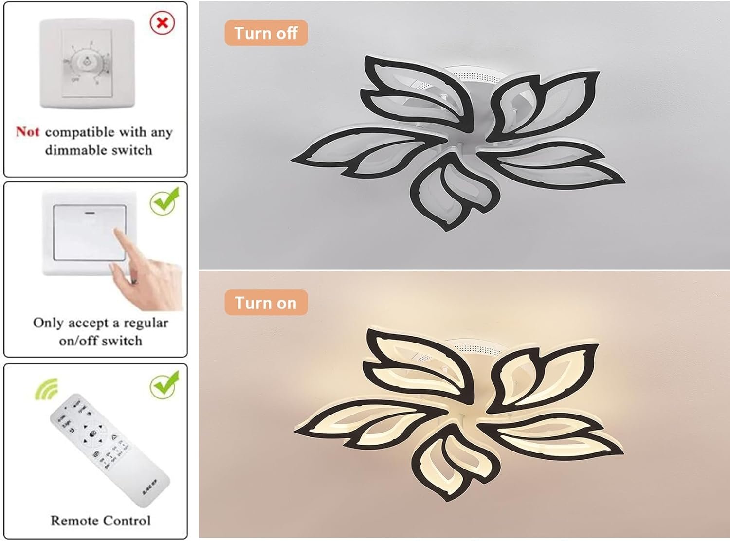 - Specification: Five leaves dining room light fixture size: 23.6 * 23.6 * 3.1 inches, ceiling plate: 9.4 inches. Power: 60W, 4800lm, Voltage: 110V. Color temperature: 3000K-6500K. NOTE:Our led ceiling light can not be used with dimmer switch.