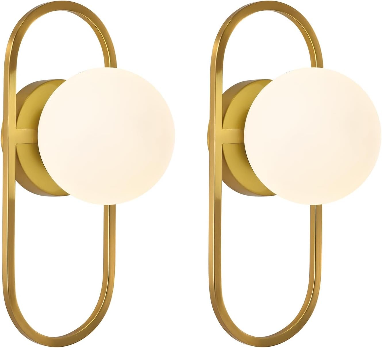 Mid Century Wall Sconces Modern Gold Vanity Wall Lamp with White Globe Lampshade Wall Light Fixture for Bathroom Bedroom Living Room Set of 2