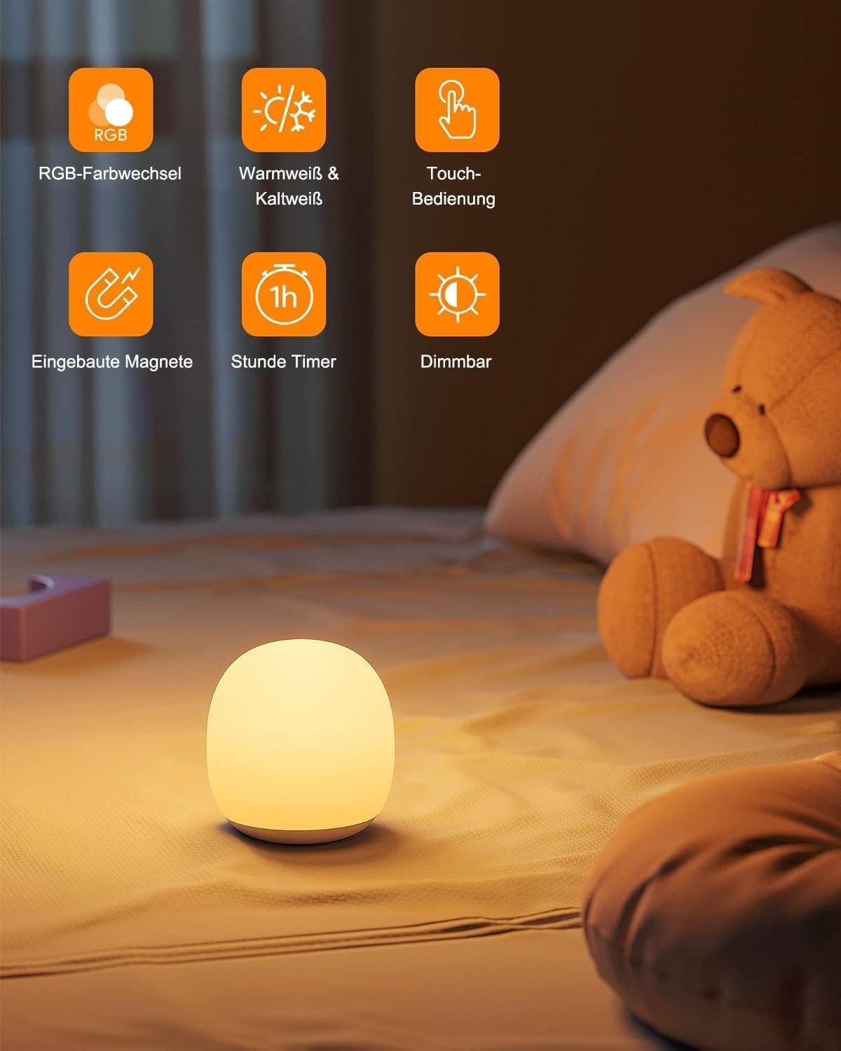 Night Light Children, Night Light Baby with Touch Control, Nursing Light, Rechargeable Magnetic Bedside Lamp, Night Light Dimmable with , 1-Hour Timer for Nursing Room, Kawaii Decoration
