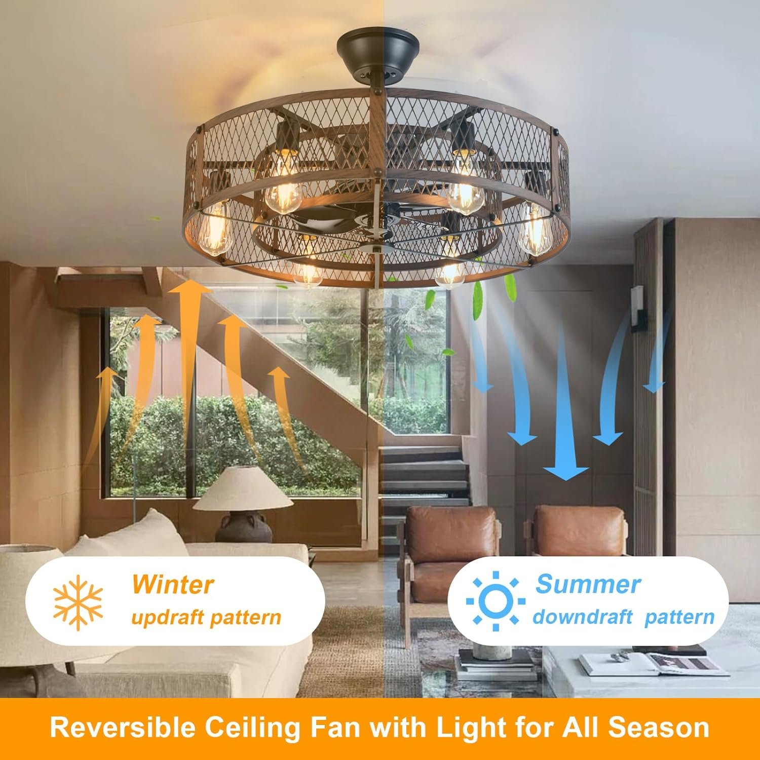 - Caged Ceiling Fans with Lights: Industrial ceiling fan designed with the farmhouse and modern style – double cage shaped frame with metal body and plastic frame, unique design can be installed on sloping ceiling. Flush mount bladeless ceiling fan with 7 ABS fan blades and 2 down rods, 6* E26 standard bases (bulbs included), ideal for your kitchen, living room, bedroom, patio, garage, or open spaces to decor your home. Notice: Our Caged Ceiling Fan all parts need to assemble, so really requires some patience and time to assemble and install