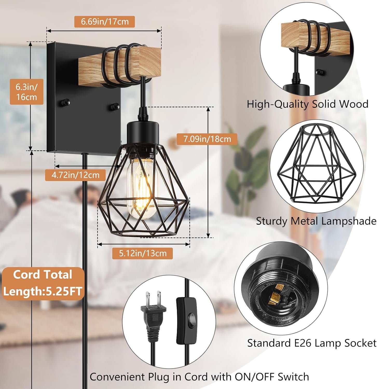 - ??High-Quality & Vintage Design??This plug in wall sconces set of two features a wall-mounted design and a metal base with a matte black finish for a glamorous look. The combination of solid wood material and diamond ?cage lampshade make these plug-in wall lamps a great decorative lighting option. Perfect for adding a splash of colour to your home.