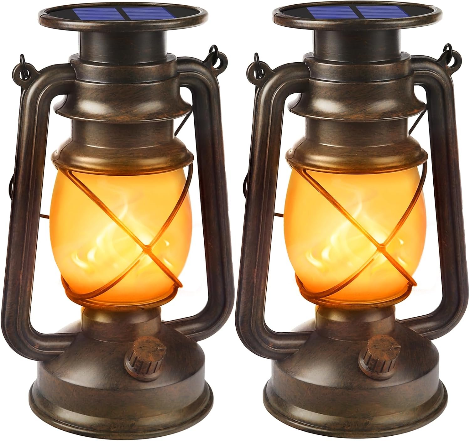 Solar Powered Lanterns Decorative Outdoor,2 Pack Bronze Vintage Lanterns with Dancing Flame,Waterproof Solar Hanging Lanterns for Camping,Patio Garden Yard Pathway Decor