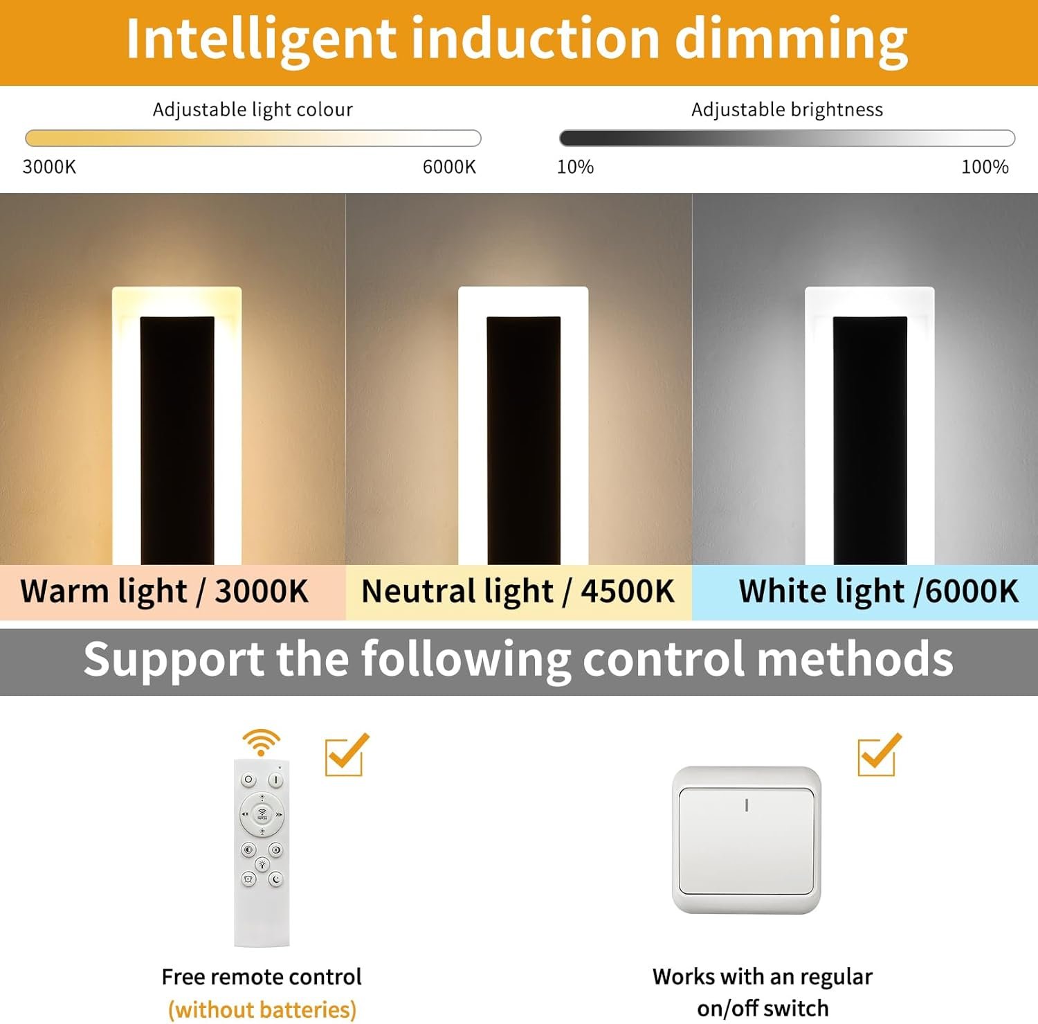 - Memory Function for Modern Exterior Lights: Set your preferred color temperature and brightness and illuminate for 10 seconds or longer (to activate the memory function). The next time you turn on the light, it will retain your previous settings. Note: The wall light supports both wall switch and remote control switch modes, which are not compatible with dimmer switches. The wall switch cannot retain the memory function of the remote control settings.